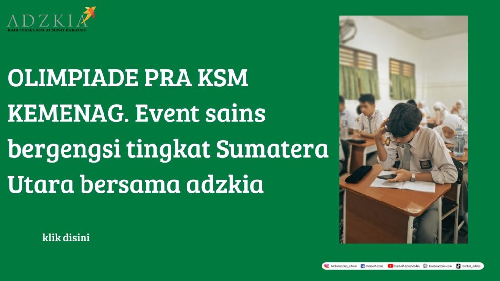 Sehubungan dengan maraknya KSM atau lebih dikenal sebagai kompetisi sains madrasah. Atau sekarang berubah nama lagi menjadi OMI (Olimpiade Madrasah Indonesia). Bimbingan Belajar Adzkia bersama dengan Kementrian Agama Sumatera Utara menisbatkan program bertajuk Olimpiade pra ksm. program ini memungkinkan siswa untuk sarana latihan “Persiapan sebelum berperang” dan evaluasi dini menghadapi KSM 2025. Kompetisi Sains Madrasah